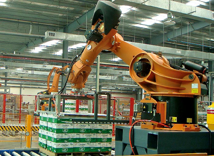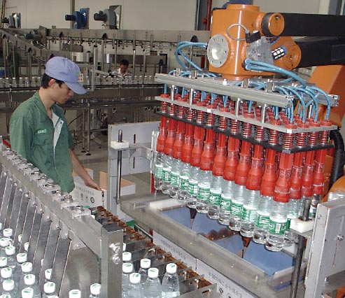 3. 灌裝生產(chǎn)線中,進(jìn)行裝箱、碼垛、拆垛作業(yè)的機(jī)器人碼垛可以靈活布局,可以同時(shí)碼垛兩條線或者多條線是灌裝生產(chǎn)線末端進(jìn)行碼垛作業(yè)的理想之選;