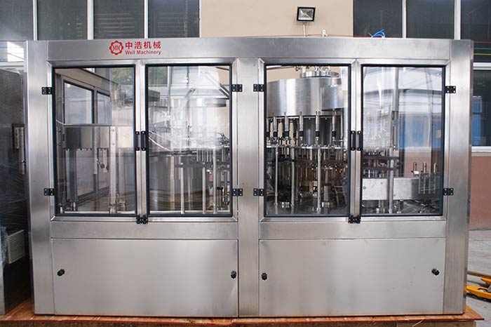 全自動三合一灌裝機械采用卡瓶頸傳動技術,實現全自動沖瓶、灌裝、旋蓋等工序,自動化程度高.