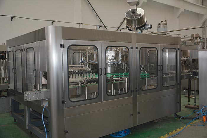 含汽飲料灌裝設備是中浩機械根據飲料灌裝工藝要求,引進、消化、吸收國外技術為基礎,創新研發而成的一種具有先進水平的等壓灌裝設備,采用風送道與進瓶撥輪直連技術